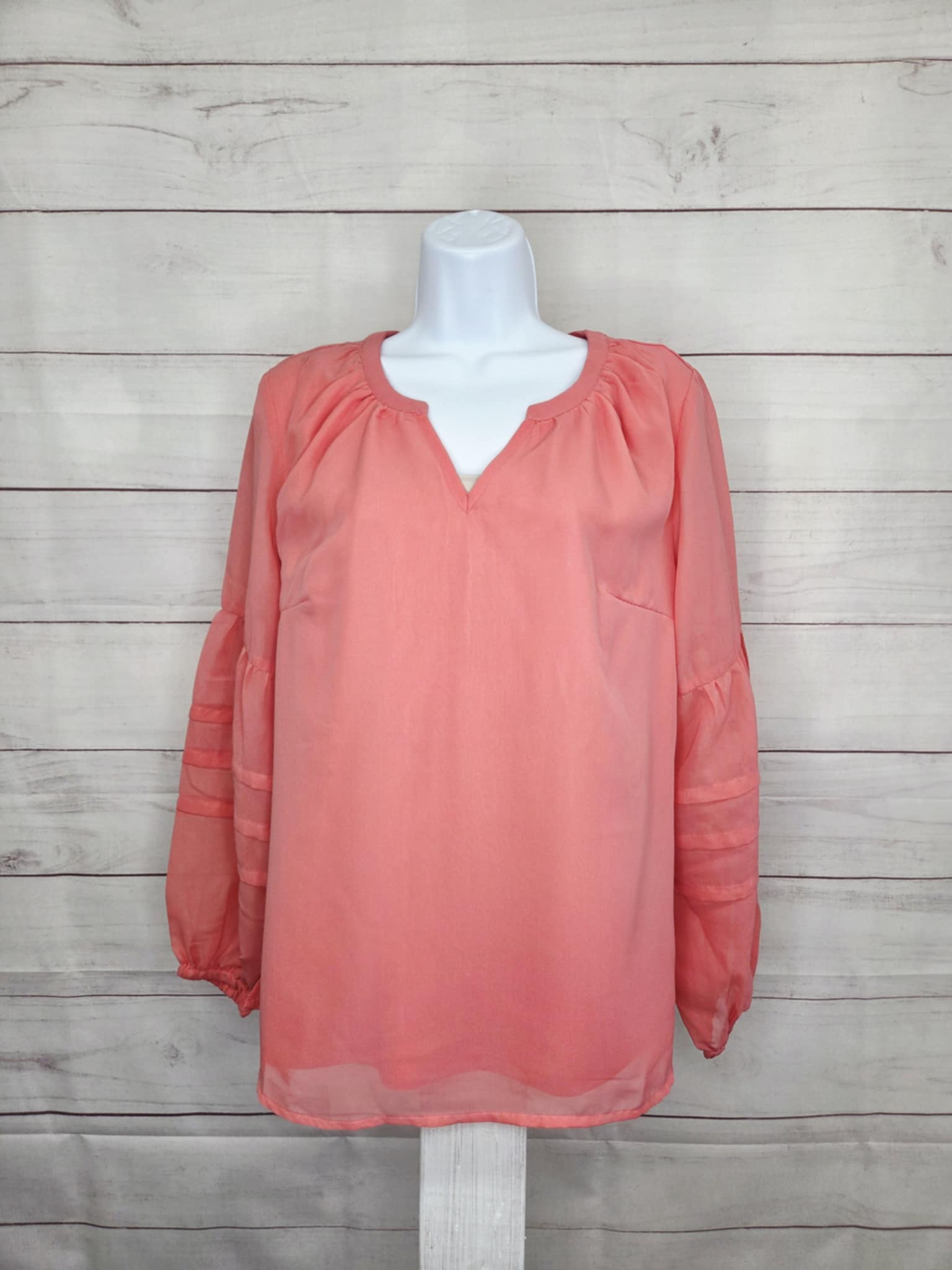 SMALL CORAL A640691 Denim & Co. Split V-Neck Blouse with Sleeve Detail
