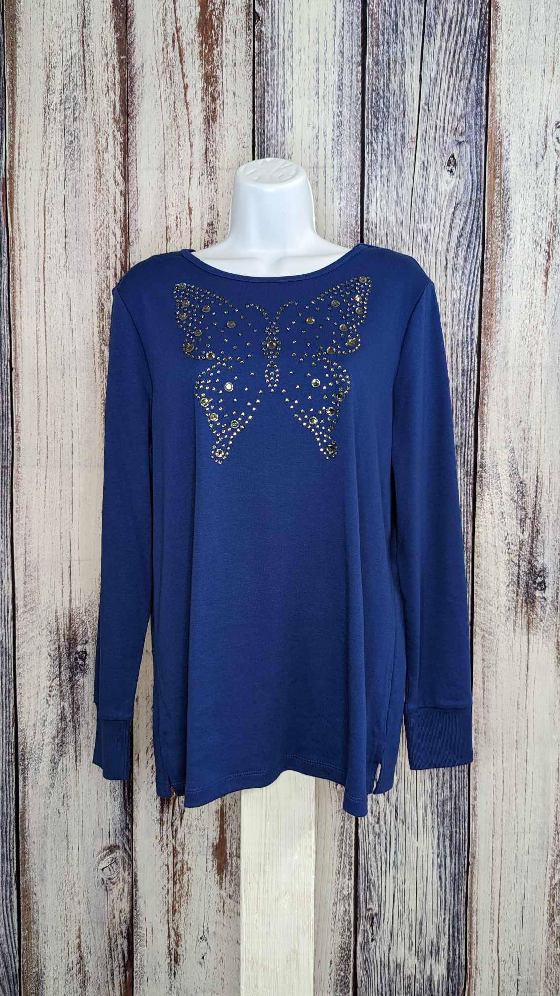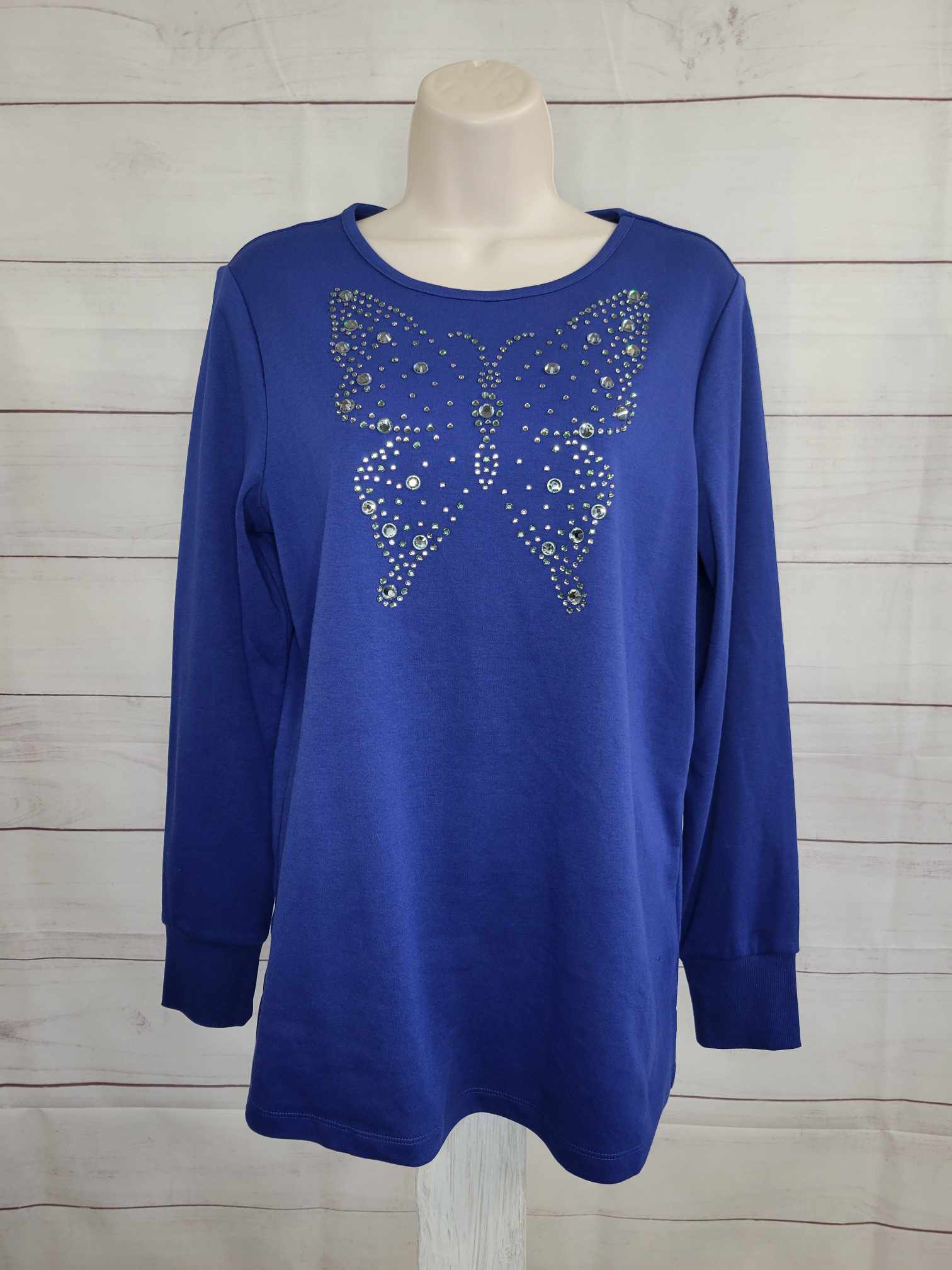 - Features: round neckline, butterfly design with stud and rhinestone embellishments, long sleeves with ribbed cuff, side vents
